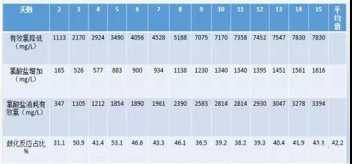 次氯酸钠的歧化反应和分解反应同时发生,按照有效氯降低的情况和氯酸盐增加的情况算出来歧化反应所占的比例,结果显示15℃的时候歧化反应大概占42.2%。